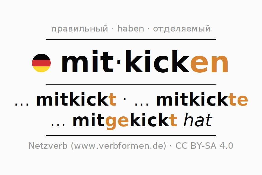 Спряжение mitkicken в Инфинитив Презенс Перфект основная форма Действительный залог (актив): mitkicken, mitzukicken.Образование этих форм происходит по определённым грамматическим правилам. Так же спрягаются простые глагольные формы mitkicken в Инфинитив. Kомментарии ☆