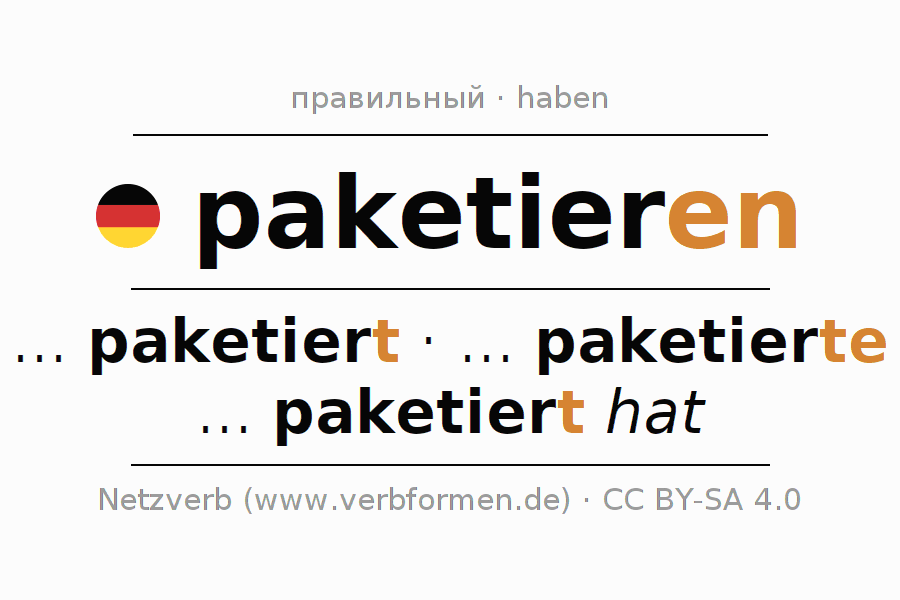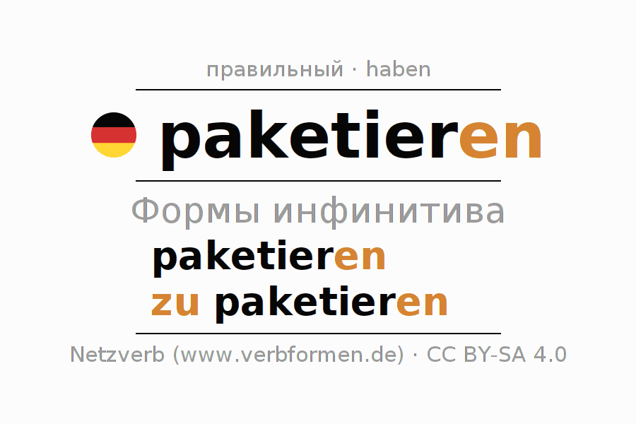 Этот глагол paketieren полностью спрягается во всех лицах и числах Инфинитив Презенс Перфект.