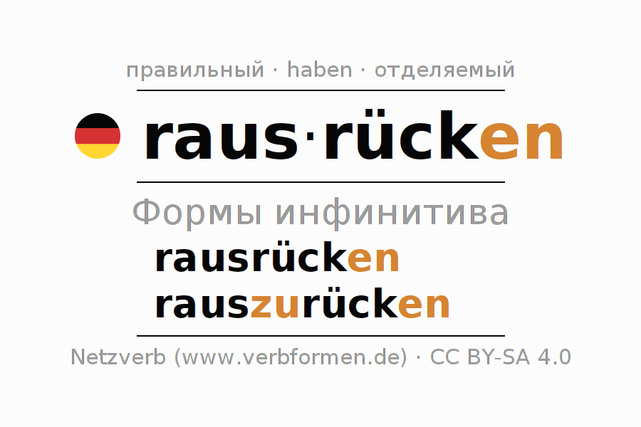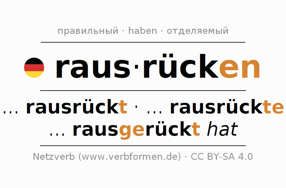 Этот глагол rausrücken (hat) полностью спрягается во всех лицах и числах Инфинитив Презенс Перфект.