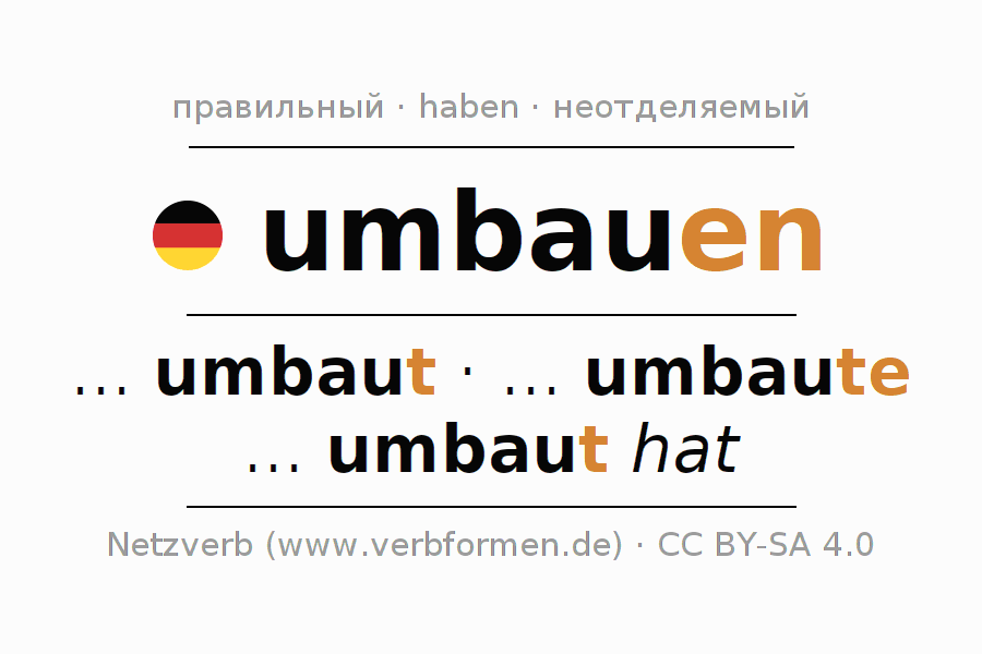 Этот глагол umbauen полностью спрягается во всех лицах и числах Инфинитив Презенс Перфект.