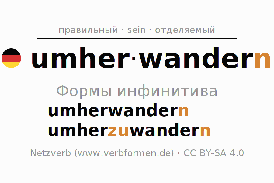 Этот глагол umherwandern полностью спрягается во всех лицах и числах Инфинитив Презенс Перфект.