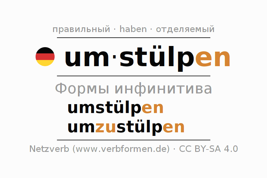 Этот глагол umstülpen полностью спрягается во всех лицах и числах Инфинитив Презенс Перфект.