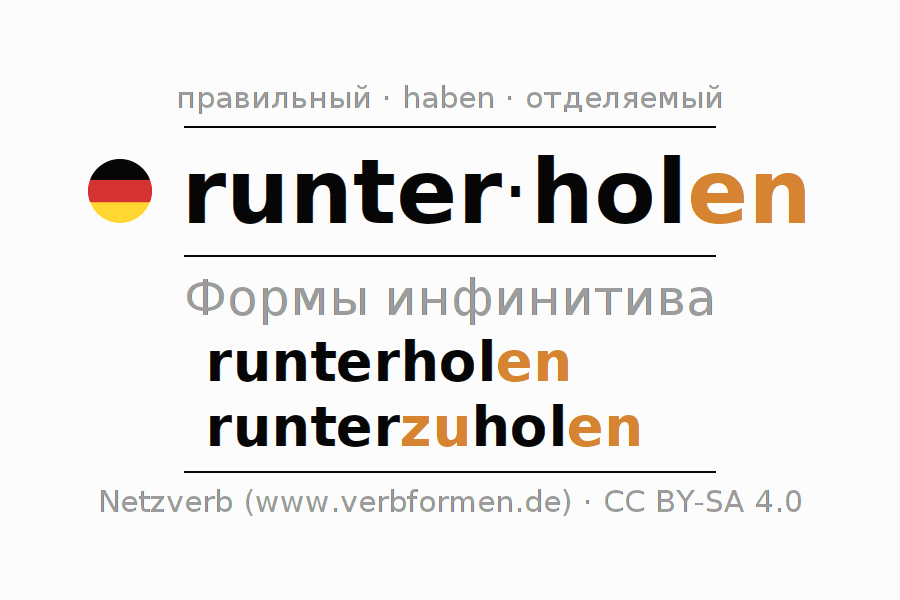 Этот глагол runterholen полностью спрягается во всех лицах и числах Инфинитив Презенс Перфект.