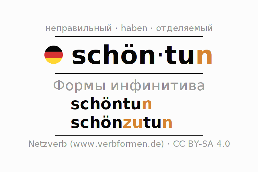 Этот глагол schöntun полностью спрягается во всех лицах и числах Инфинитив Презенс Перфект.
