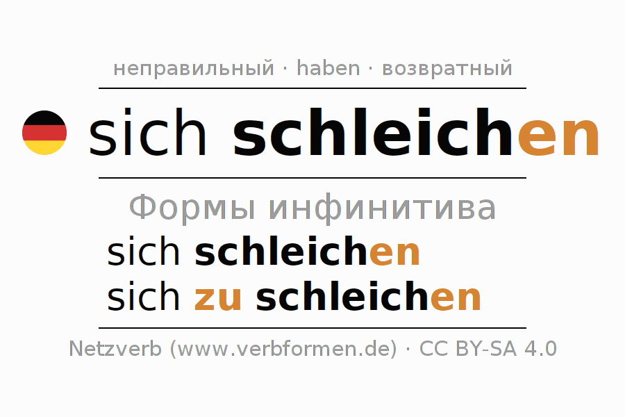 Инфинитивы sich schleichen (красться, забираться): sich schleichen, sich zu schleichen. К schleich (глагольная основа) прибавляется окончание (суффикс) en. При образовании инфинитива с zu , zu ставится отдельно и предшествует нормальному инфинитиву, так как он не имеет отделяемой первоначальной части (суффикса). Образование форм соответствует грамматическим правилам спряжения глаголов в неопределённой форме. Kомментарии