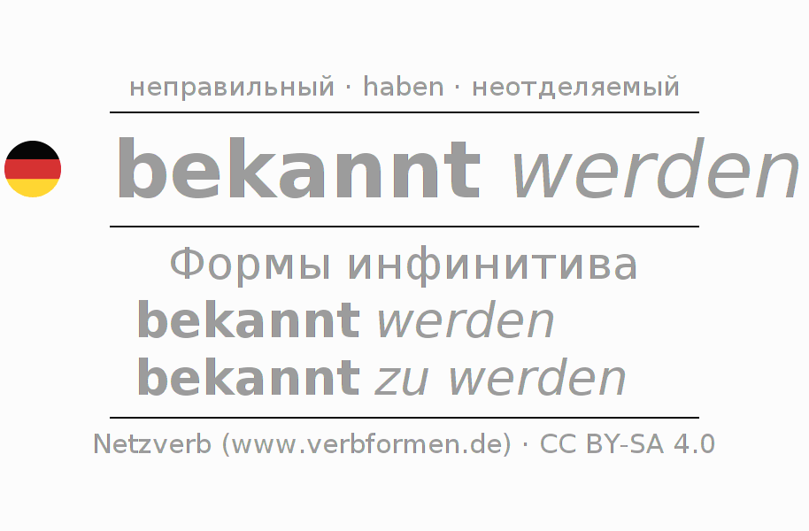 Спряжение bekennen в Инфинитив Презенс Перфект основная форма Пассив с werden: bekannt werden, bekannt zu werden.Образование этих форм происходит по определённым грамматическим правилам. Так же спрягаются простые глагольные формы bekennen в Инфинитив. Kомментарии ☆
