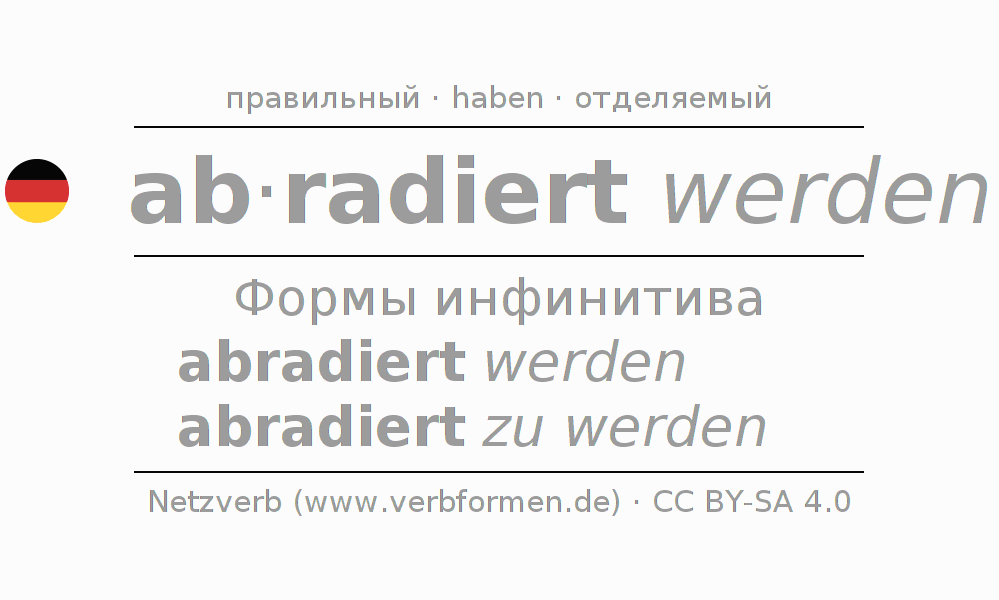 Этот глагол abradieren полностью спрягается во всех лицах и числах Инфинитив Презенс Перфект.
