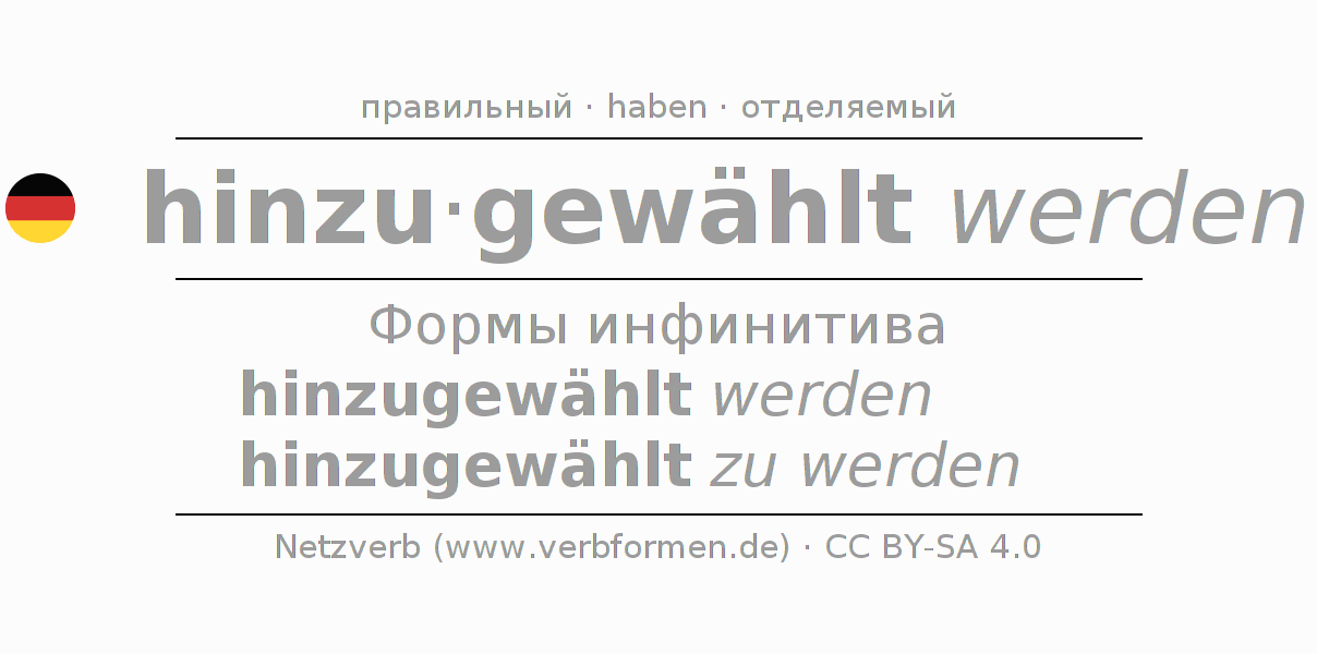 Этот глагол hinzuwählen полностью спрягается во всех лицах и числах Инфинитив Презенс Перфект.