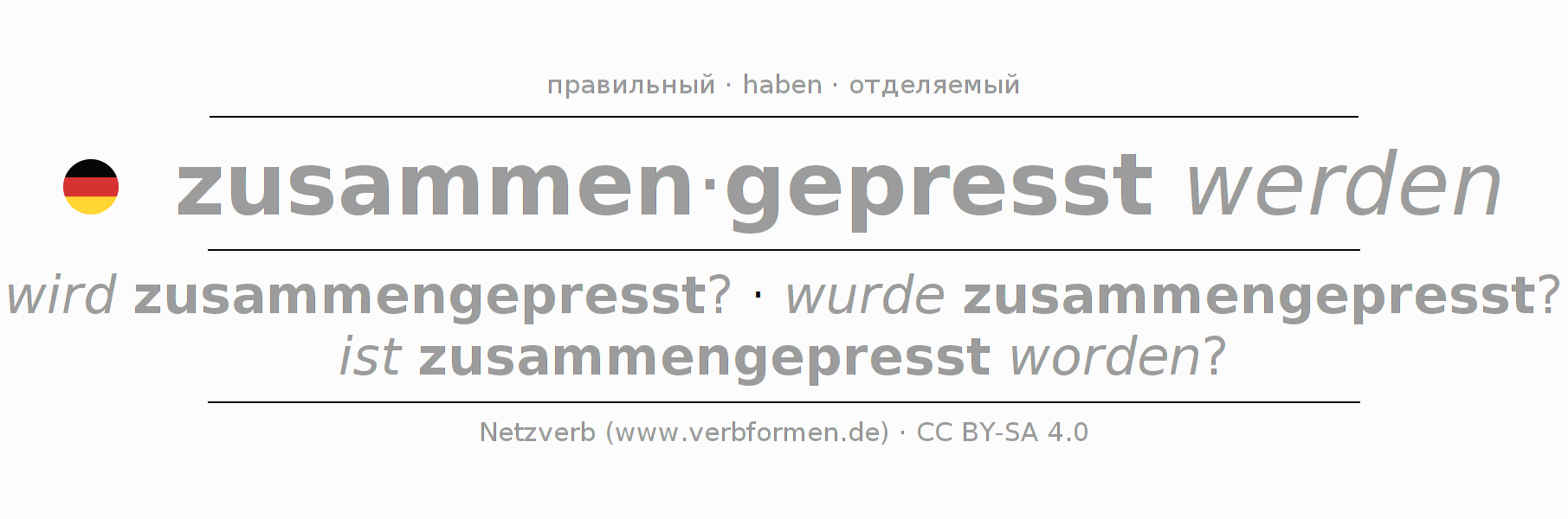 Этот глагол zusammenpressen полностью спрягается во всех лицах и числах Инфинитив Презенс Перфект.