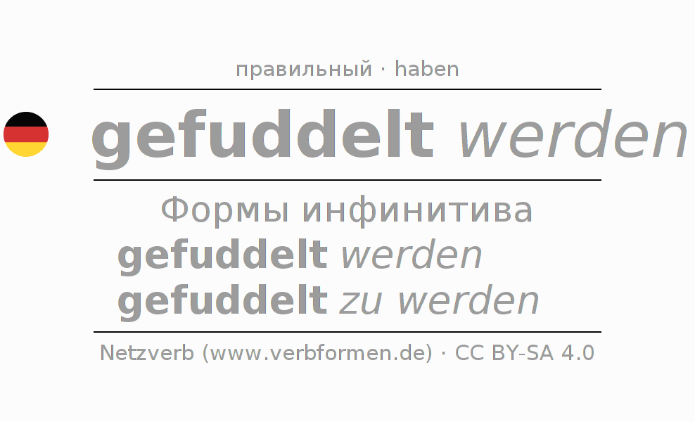 Этот глагол fuddeln полностью спрягается во всех лицах и числах Инфинитив Презенс Перфект.