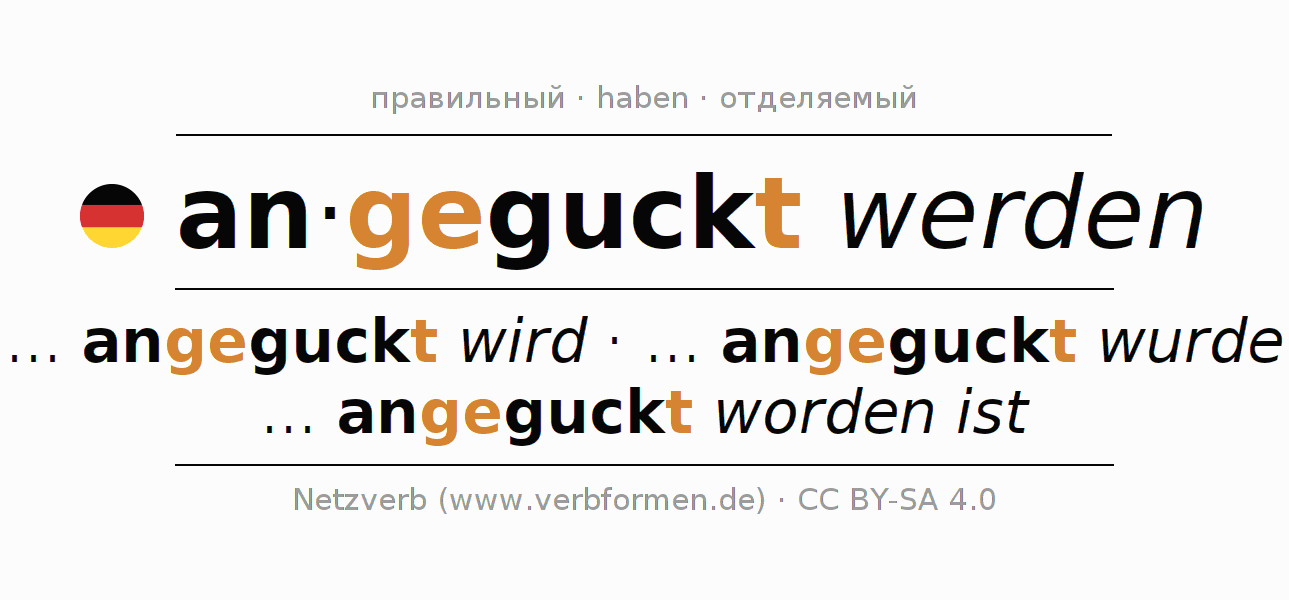 Этот глагол angucken полностью спрягается во всех лицах и числах Инфинитив Презенс Перфект.