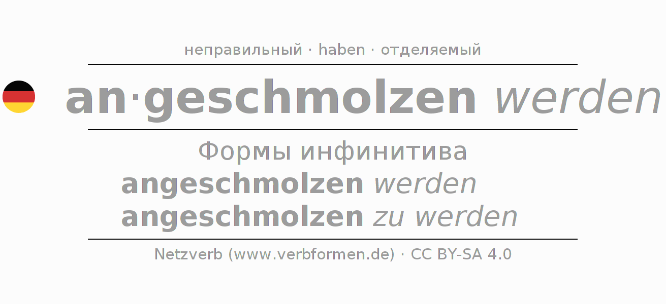 Этот глагол anschmelzen (hat) полностью спрягается во всех лицах и числах Инфинитив Презенс Перфект.