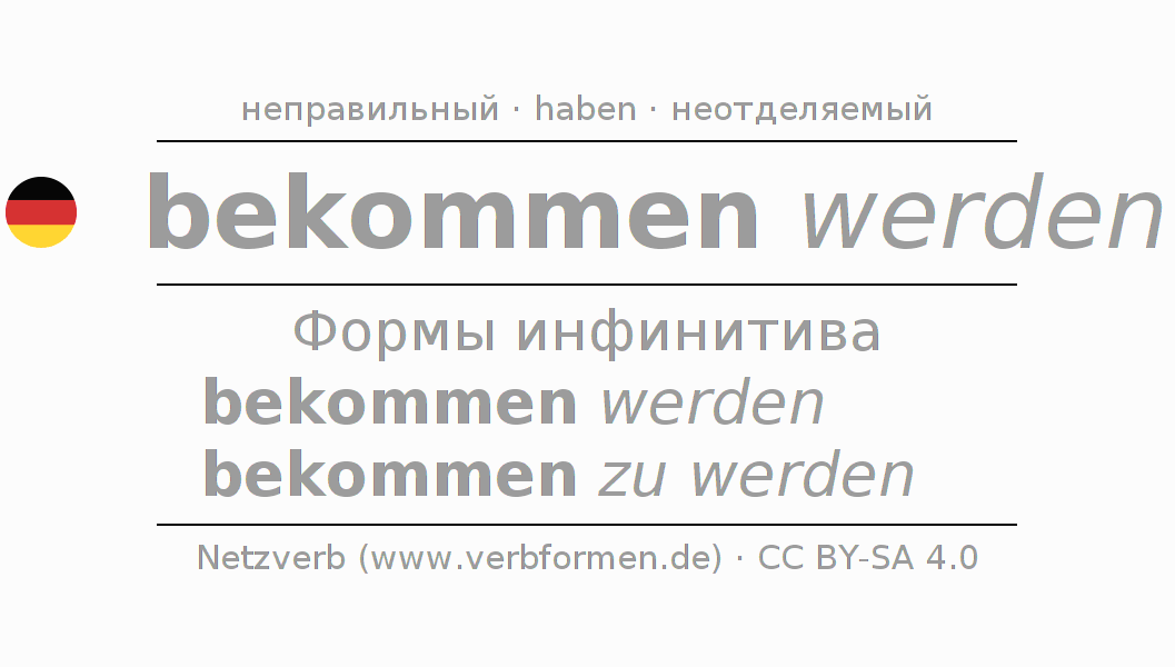 Спряжение bekommen в Инфинитив Презенс Перфект основная форма Пассив с werden: bekommen werden, bekommen zu werden.Образование этих форм происходит по определённым грамматическим правилам. Так же спрягаются простые глагольные формы bekommen в Инфинитив. 1Комментарий ☆5.0