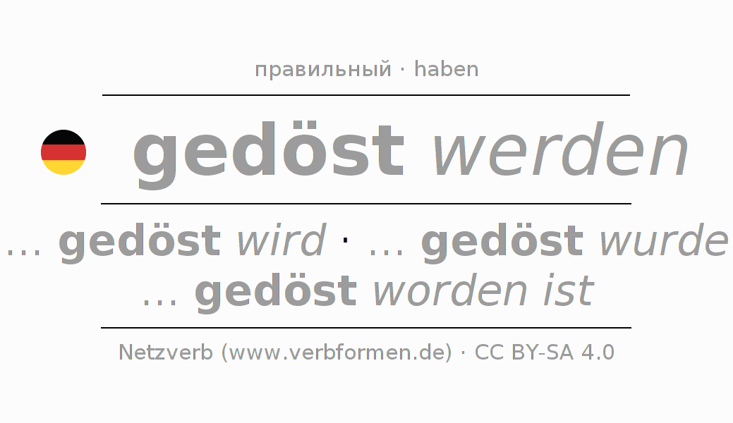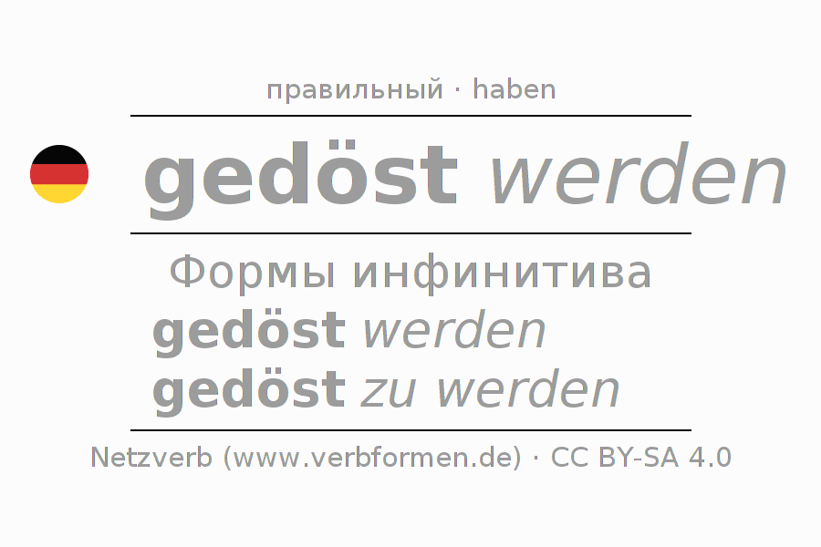 Спряжение dösen в Инфинитив Презенс Перфект основная форма Пассив с werden: gedöst werden, gedöst zu werden.Образование этих форм происходит по определённым грамматическим правилам. Так же спрягаются простые глагольные формы dösen в Инфинитив. Kомментарии ☆