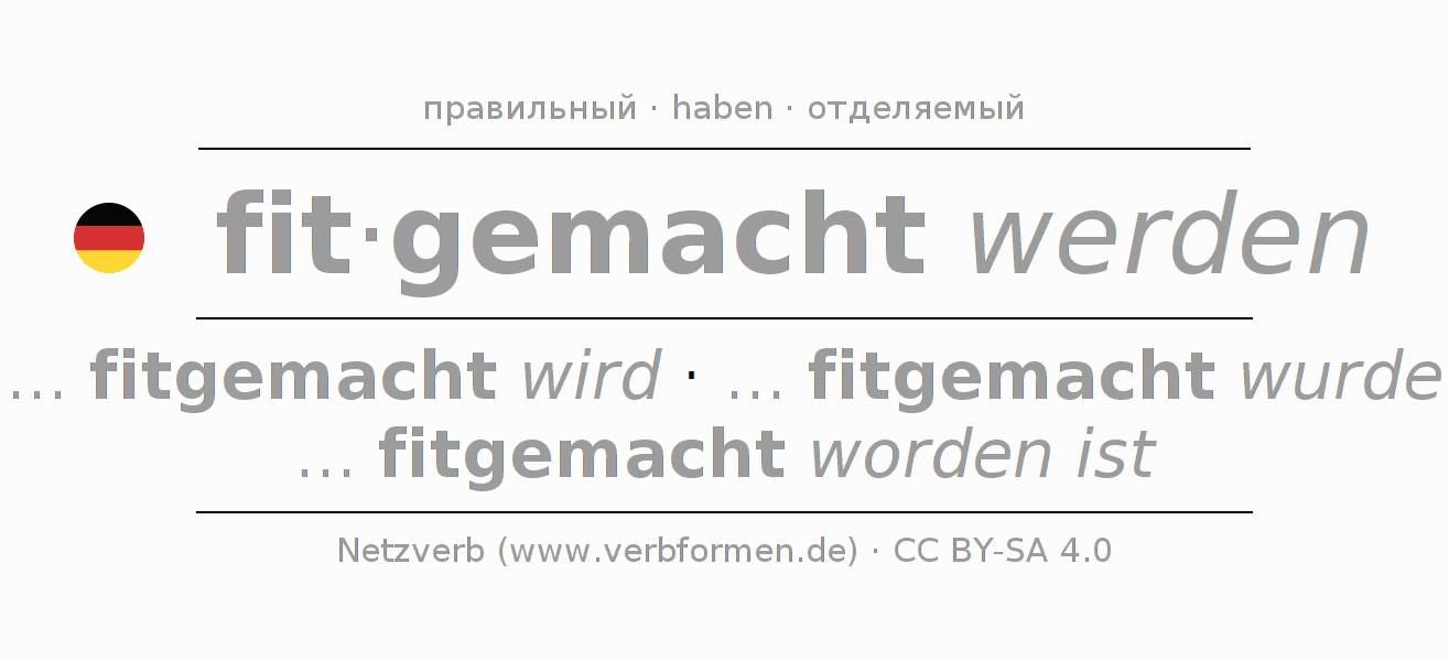 Этот глагол fitmachen полностью спрягается во всех лицах и числах Инфинитив Презенс Перфект.
