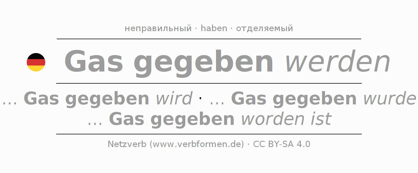 Спряжение gasgeben в Инфинитив Презенс Перфект основная форма Пассив с werden: Gas gegeben werden, Gas gegeben zu werden.Образование этих форм происходит по определённым грамматическим правилам. Так же спрягаются простые глагольные формы gasgeben в Инфинитив. Kомментарии ☆