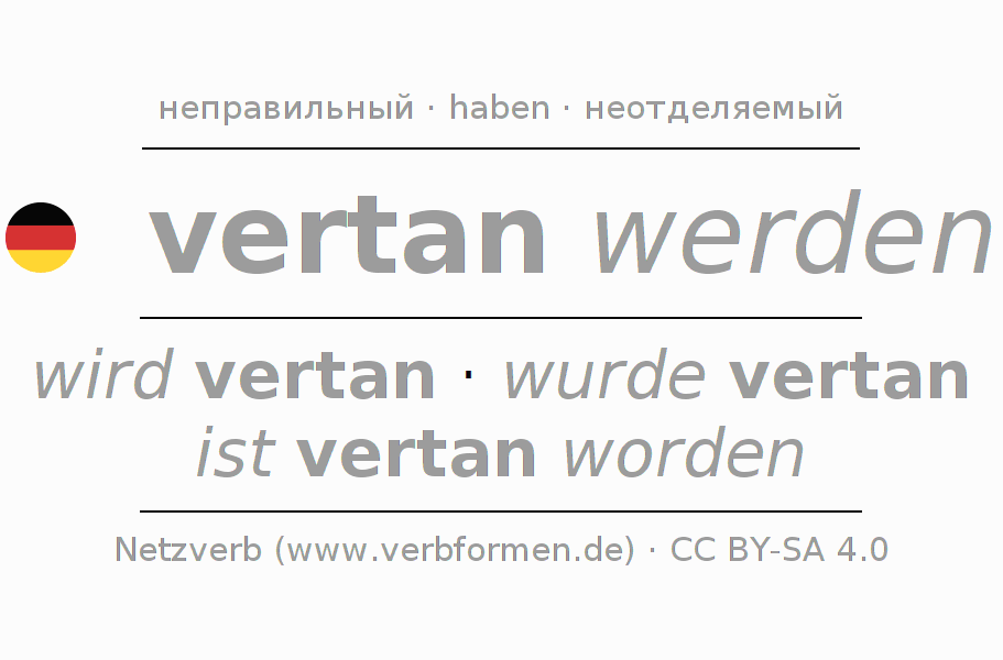 Спряжение vertun в Инфинитив Презенс Перфект основная форма Пассив с werden: vertan werden, vertan zu werden.Образование этих форм происходит по определённым грамматическим правилам. Так же спрягаются простые глагольные формы vertun в Инфинитив. Kомментарии ☆