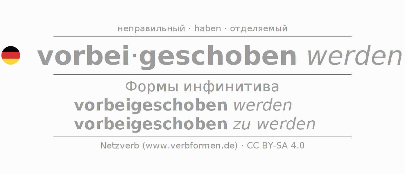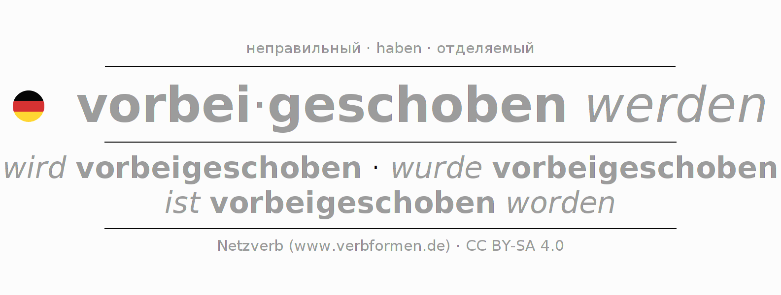 Этот глагол vorbeischieben полностью спрягается во всех лицах и числах Инфинитив Презенс Перфект.
