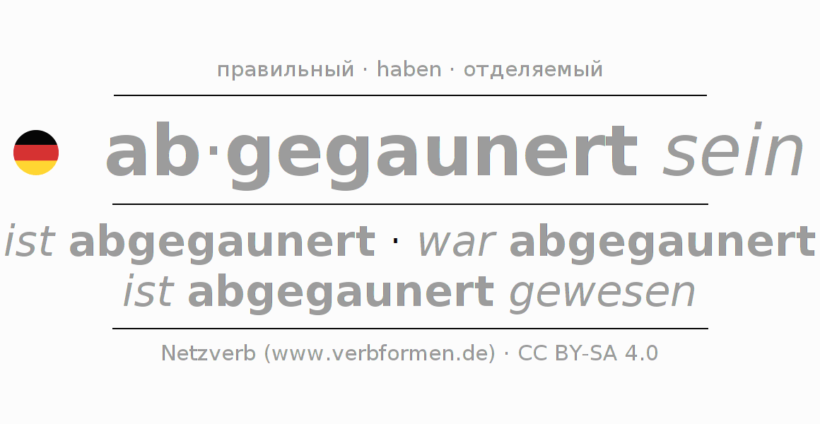 Этот глагол abgaunern полностью спрягается во всех лицах и числах Инфинитив Презенс Перфект.