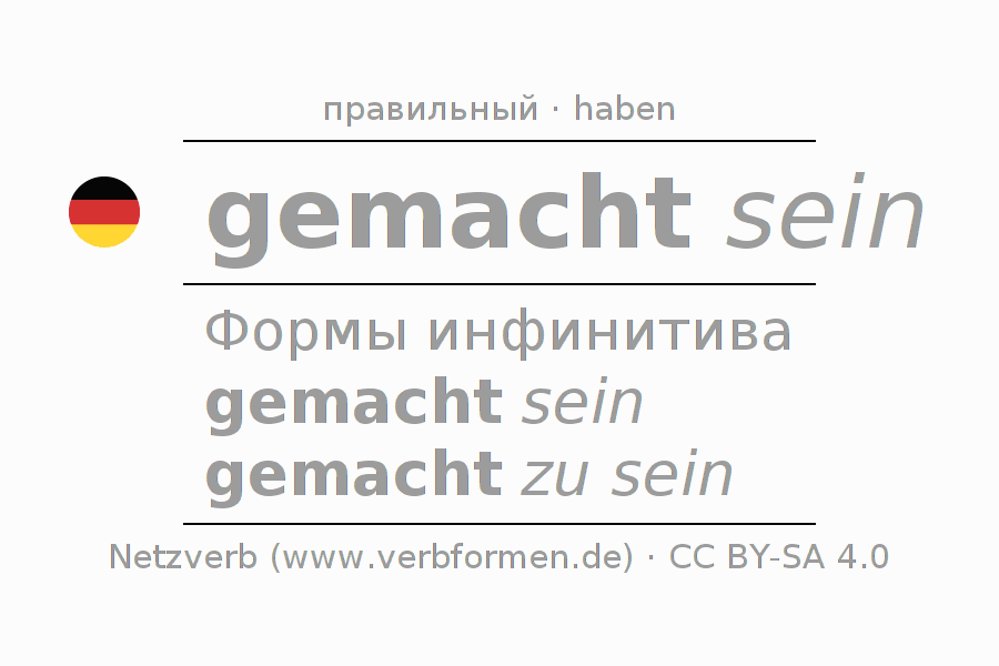 Спряжение machen в Инфинитив Презенс Перфект основная форма Пассив с sein: gemacht sein, gemacht zu sein.Образование этих форм происходит по определённым грамматическим правилам. Так же спрягаются простые глагольные формы machen в Инфинитив. Kомментарии ☆