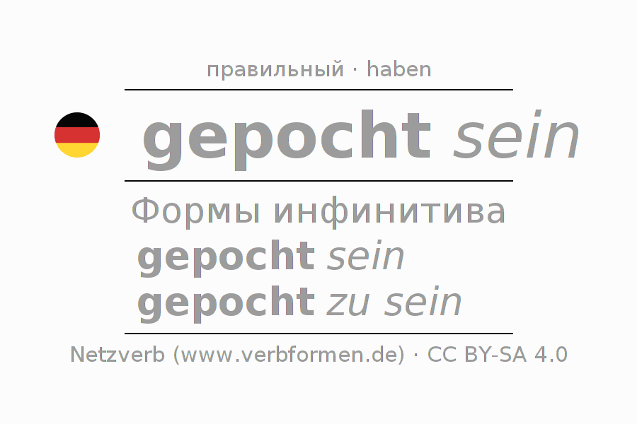 Спряжение pochen в Инфинитив Презенс Перфект основная форма Пассив с sein: gepocht sein, gepocht zu sein.Образование этих форм происходит по определённым грамматическим правилам. Так же спрягаются простые глагольные формы pochen в Инфинитив. Kомментарии ☆
