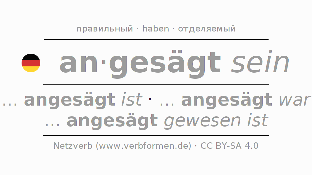 Спряжение ansägen в Инфинитив Презенс Перфект основная форма Пассив с sein: angesägt sein, angesägt zu sein.Образование этих форм происходит по определённым грамматическим правилам. Так же спрягаются простые глагольные формы ansägen в Инфинитив. Kомментарии ☆