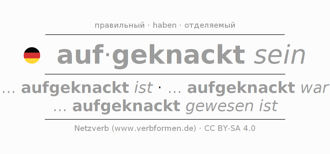 Этот глагол aufknacken полностью спрягается во всех лицах и числах Инфинитив Презенс Перфект.