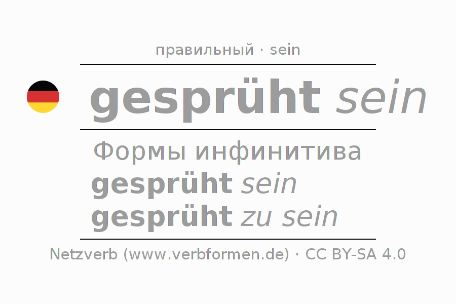 Спряжение sprühen в Инфинитив Презенс Перфект основная форма Пассив с sein: gesprüht sein, gesprüht zu sein.Образование этих форм происходит по определённым грамматическим правилам. Так же спрягаются простые глагольные формы sprühen в Инфинитив. Kомментарии ☆
