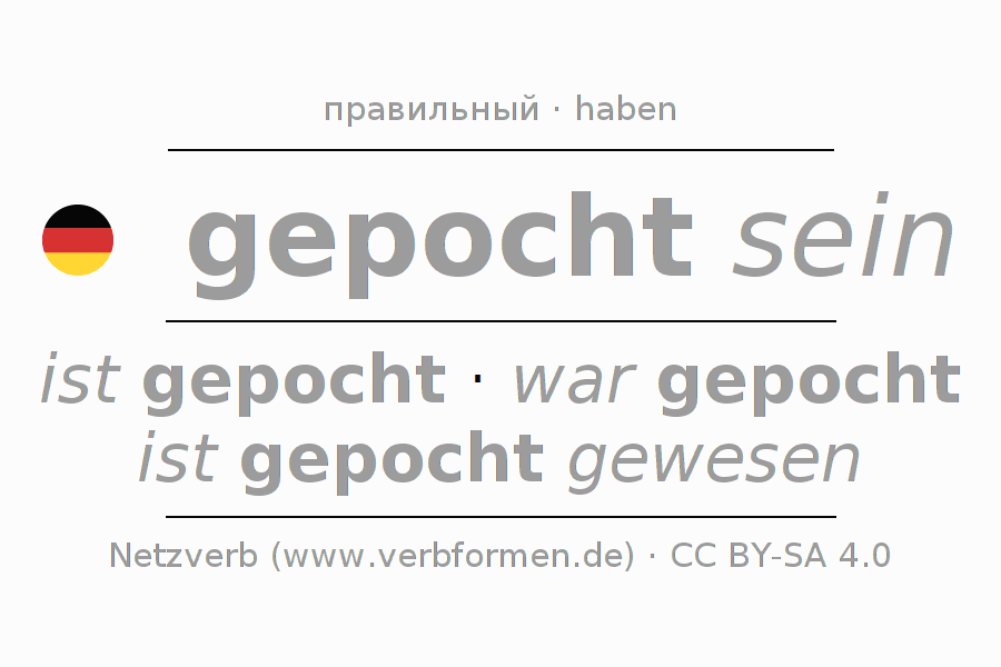 Спряжение pochen в Инфинитив Презенс Перфект основная форма Пассив с sein: gepocht sein, gepocht zu sein.Образование этих форм происходит по определённым грамматическим правилам. Так же спрягаются простые глагольные формы pochen в Инфинитив. Kомментарии ☆