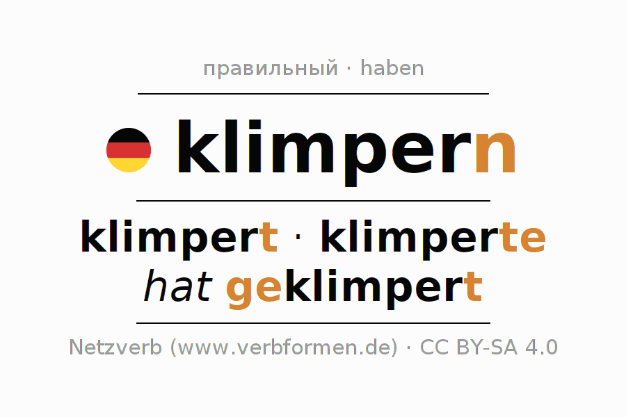 Глагол 'klimpern' онлайн как таблица глаголов со всеми наглядно представленными формами. Значение глагола klimpern таким образом является помощью для выполнения домашних заданий; подготовки к экзаменам и контрольным работам, а также к урокам немецкого языка; для обучения в вузах и при получении образования для взрослых. Именно для изучающих немецкий язык – правильное спряжение глаголов (klimpert - klimperte - hat geklimpert) является решающим фактором.