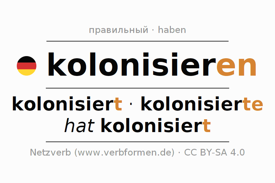 Глагол kolonisieren спрягается в индикативе Действительный залог (актив) в настоящем, прошедшем и будущем времени