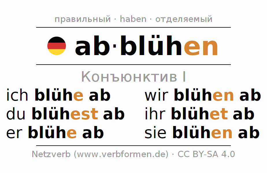 Спряжение abblühen (увянуть, вянуть) в сослагательном наклонении I: ich blühe ab, du blühest ab, er blühe ab, wir blühen ab, ihr blühet ab, sie blühen ab.