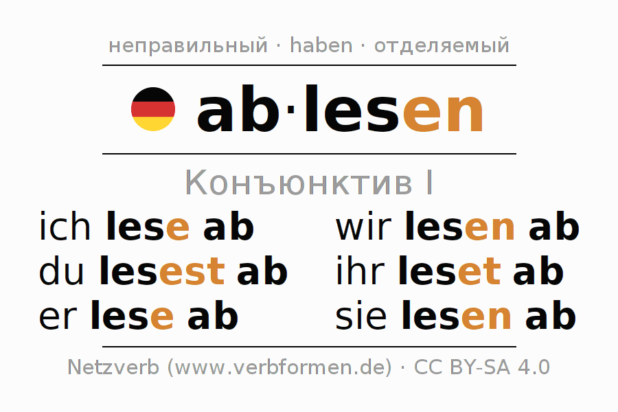 Спряжение ablesen (снимать показания, считывать) в сослагательном наклонении I: ich lese ab, du lesest ab, er lese ab, wir lesen ab, ihr leset ab, sie lesen ab.