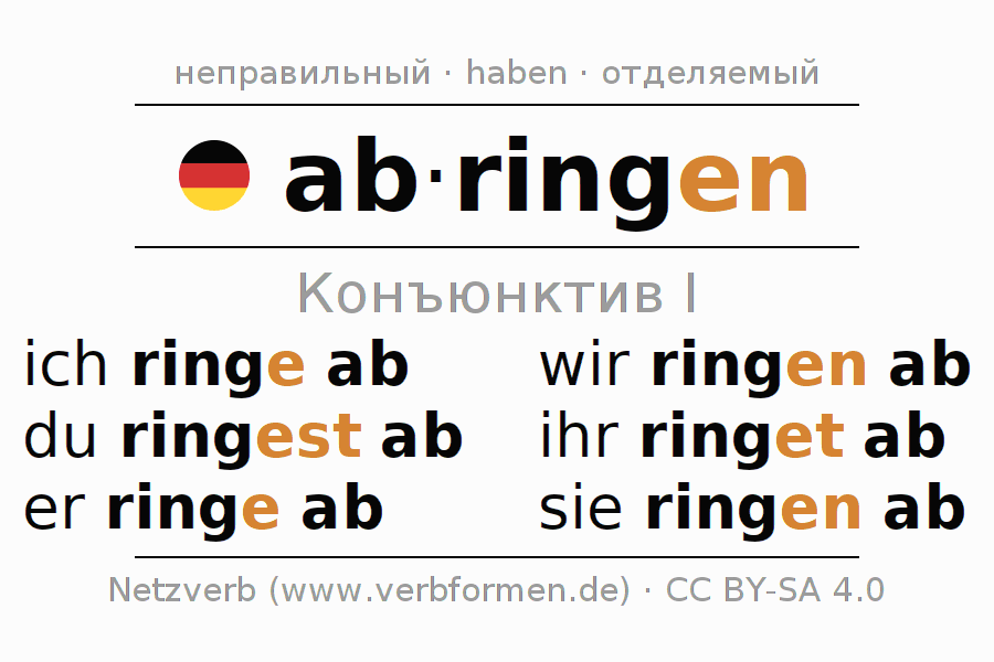 Спряжение abringen (вынуждать, вырвать) в сослагательном наклонении I: ich ringe ab, du ringest ab, er ringe ab, wir ringen ab, ihr ringet ab, sie ringen ab.
