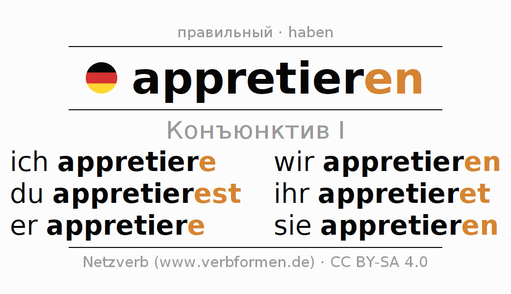 Этот глагол appretieren полностью спрягается во всех лицах и числах Koнъюнктив Презенс.