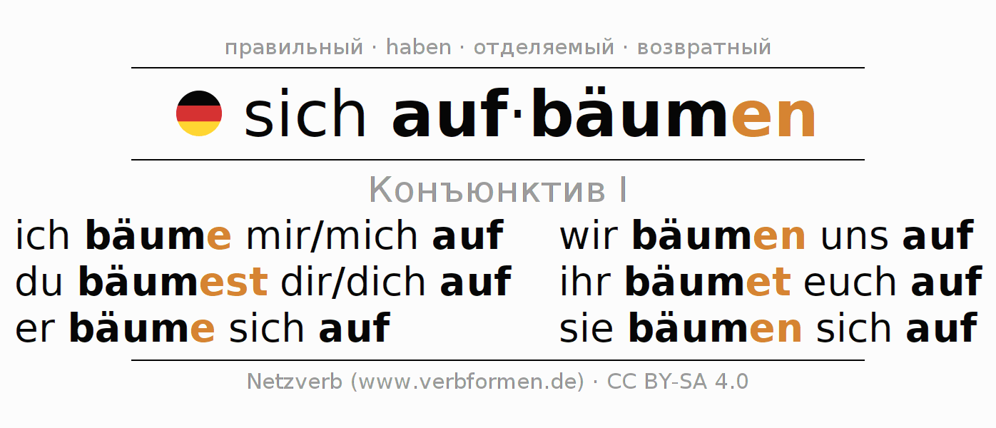 Спряжение sich aufbäumen (восставать, противиться) в сослагательном наклонении I: ich bäume mir/mich auf, du bäumest dir/dich auf, er bäume sich auf, wir bäumen uns auf, ihr bäumet euch auf, sie bäumen sich auf.