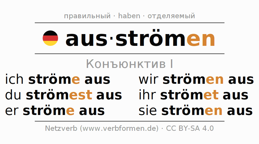 Спряжение ausströmen (излучать, веять) в сослагательном наклонении I: ich ströme aus, du strömest aus, er ströme aus, wir strömen aus, ihr strömet aus, sie strömen aus.