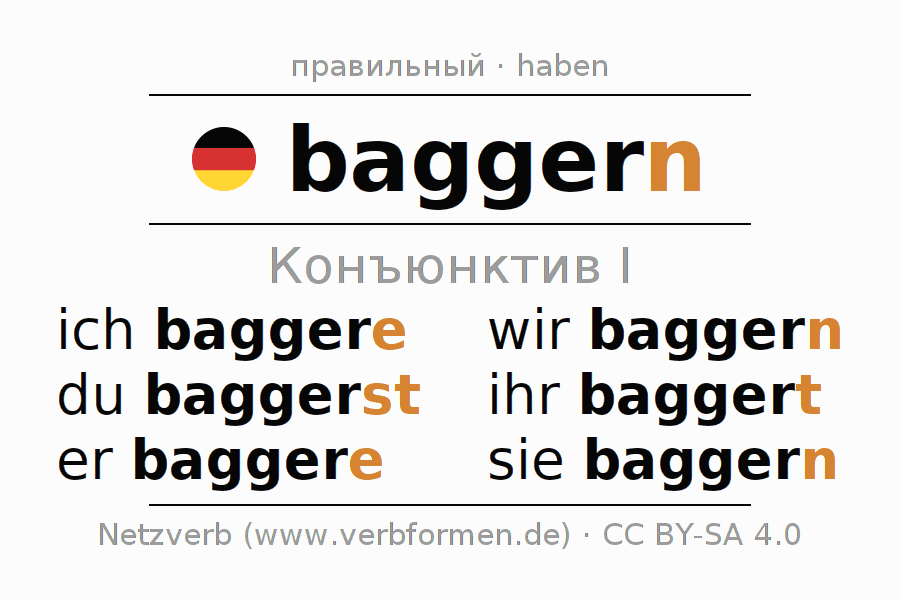 Спряжение baggern (копать, баггер) в сослагательном наклонении I: ich bagg(e)re, du baggerst, er bagg(e)re, wir baggern, ihr baggert, sie baggern.