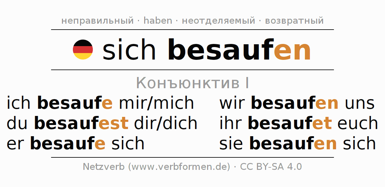 Спряжение sich besaufen (напиваться, напиться) в сослагательном наклонении I: ich besaufe mir/mich, du besaufest dir/dich, er besaufe sich, wir besaufen uns, ihr besaufet euch, sie besaufen sich.