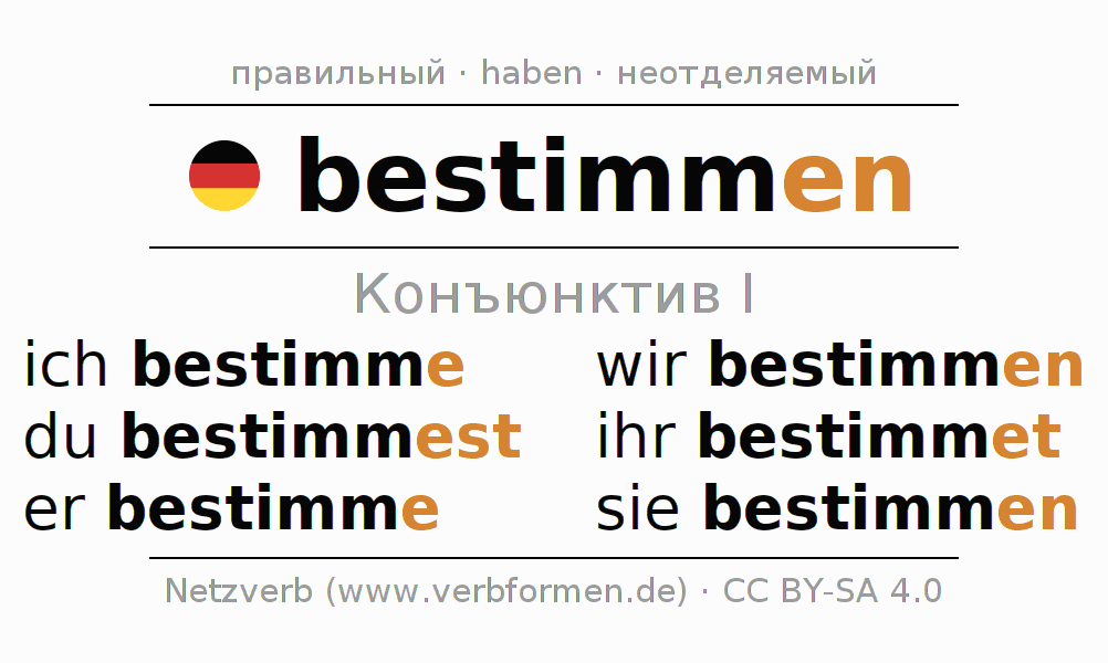 Спряжение bestimmen (определять, устанавливать) в сослагательном наклонении I: ich bestimme, du bestimmest, er bestimme, wir bestimmen, ihr bestimmet, sie bestimmen.