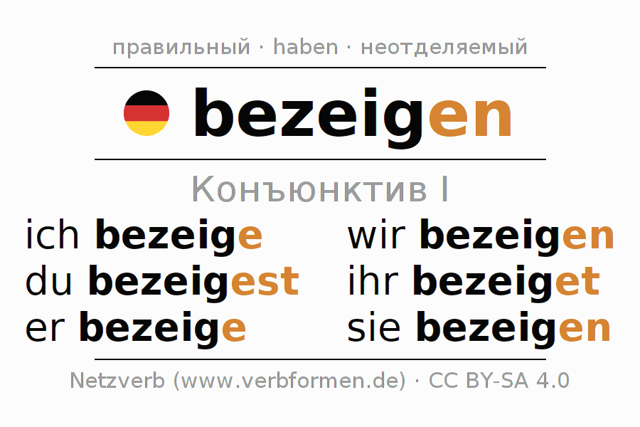 Спряжение bezeigen (выражать, доказать) в сослагательном наклонении I: ich bezeige, du bezeigest, er bezeige, wir bezeigen, ihr bezeiget, sie bezeigen.