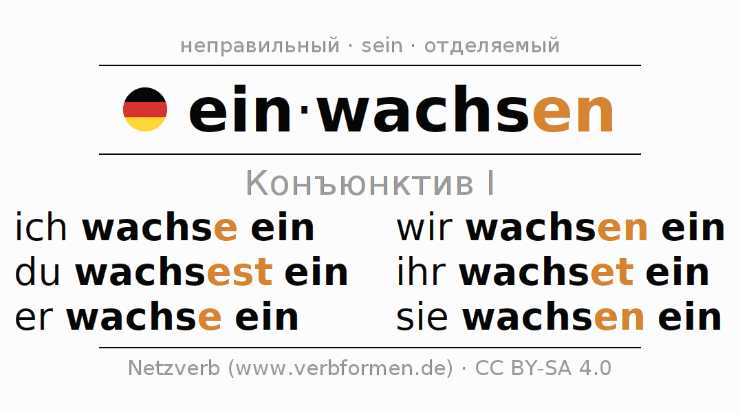 Спряжение einwachsen (врастать, врасти) в сослагательном наклонении I: ich wachse ein, du wachsest ein, er wachse ein, wir wachsen ein, ihr wachset ein, sie wachsen ein.