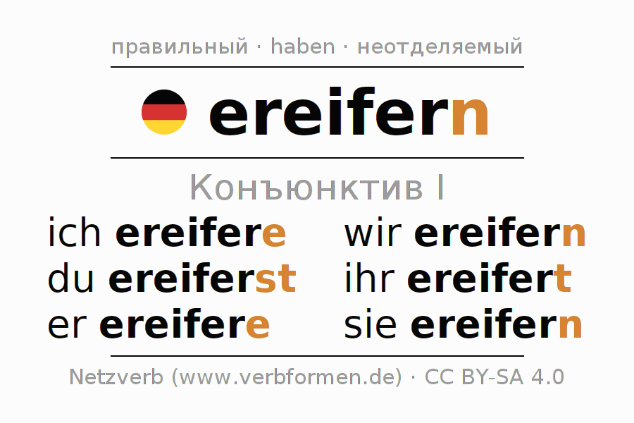 Этот глагол ereifern полностью спрягается во всех лицах и числах Koнъюнктив Презенс.