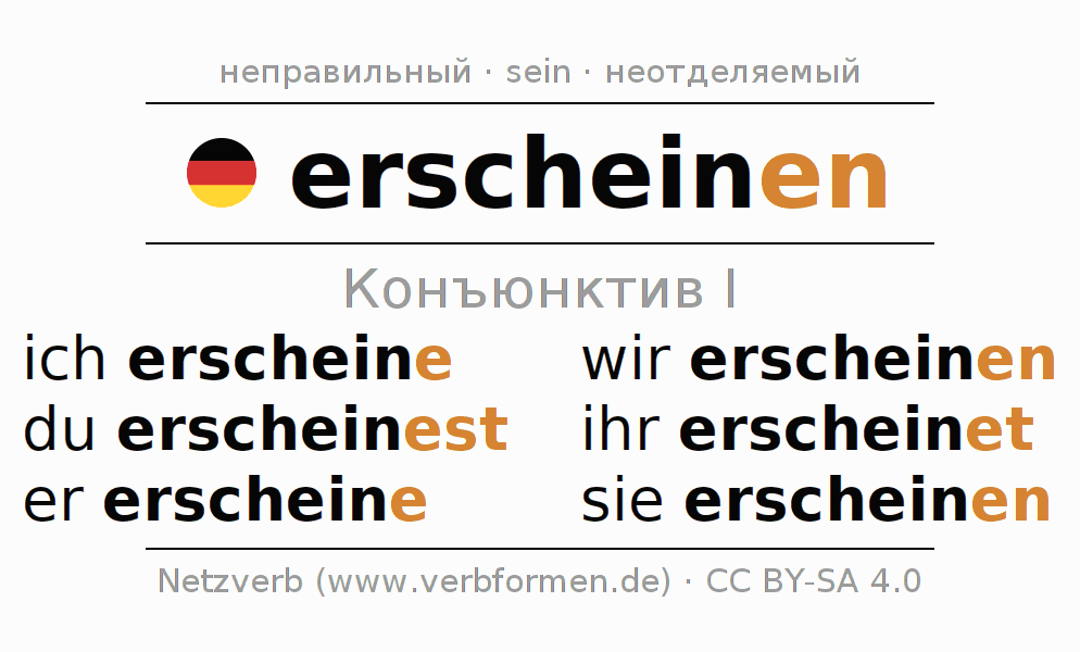 Спряжение erscheinen (появляться, казаться) в сослагательном наклонении I: ich erscheine, du erscheinest, er erscheine, wir erscheinen, ihr erscheinet, sie erscheinen.