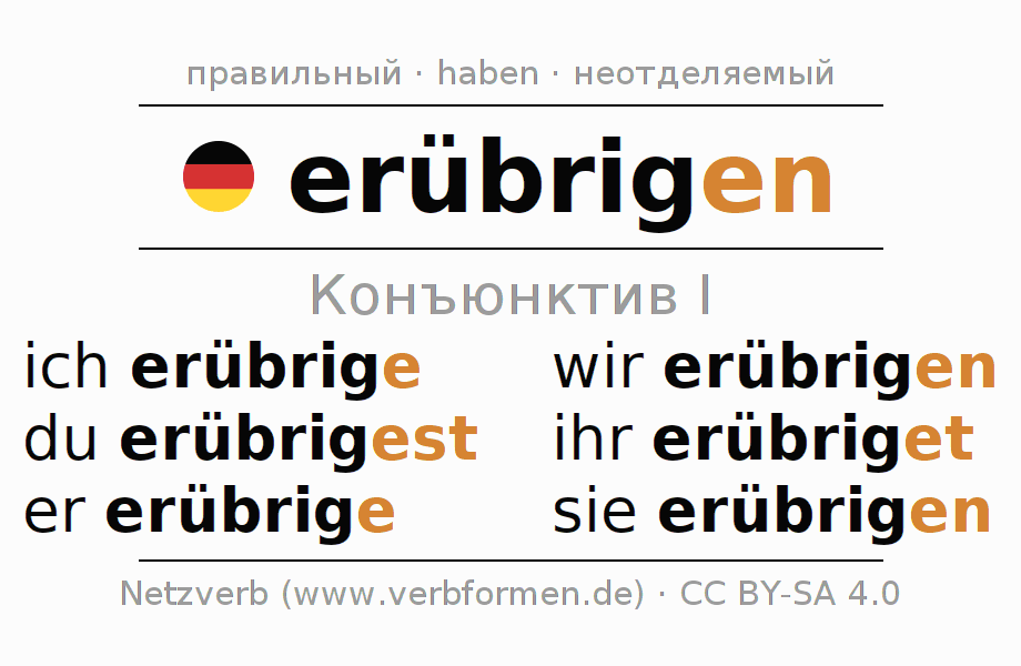 Спряжение erübrigen (сберегать, быть излишним) в сослагательном наклонении I: ich erübrige, du erübrigest, er erübrige, wir erübrigen, ihr erübriget, sie erübrigen.