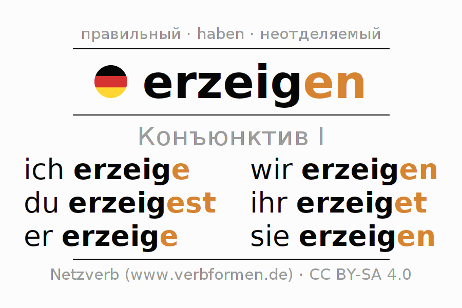 Спряжение erzeigen (выражать, выявляться) в сослагательном наклонении I: ich erzeige, du erzeigest, er erzeige, wir erzeigen, ihr erzeiget, sie erzeigen.