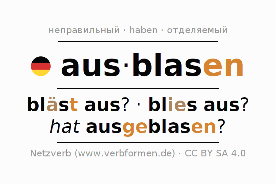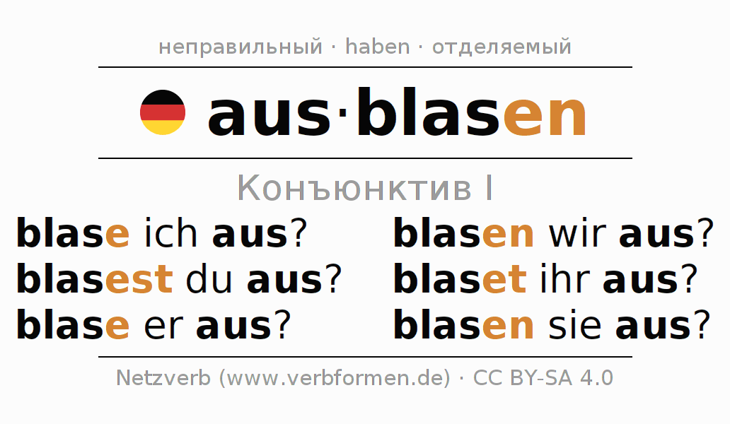 Спряжение ausblasen в Koнъюнктив Презенс Сослагательное наклонение Действительный залог (актив): blase ich aus?, blasest du aus?, blase er aus?, blasen wir aus?, blaset ihr aus?, blasen sie aus?.Образование этих форм происходит по определённым грамматическим правилам. Так же спрягаются простые глагольные формы ausblasen в Конъюнктив I. Kомментарии ☆