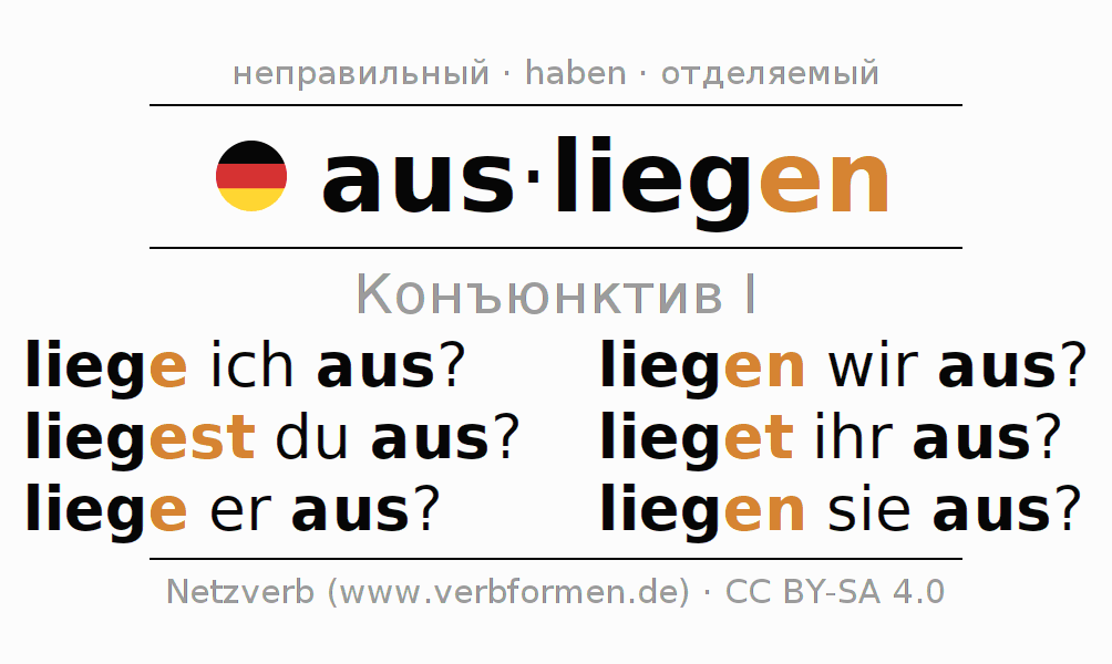 Спряжение ausliegen в Koнъюнктив Презенс Сослагательное наклонение Действительный залог (актив): liege ich aus?, liegest du aus?, liege er aus?, liegen wir aus?, lieget ihr aus?, liegen sie aus?.Образование этих форм происходит по определённым грамматическим правилам. Так же спрягаются простые глагольные формы ausliegen в Конъюнктив I. Kомментарии ☆