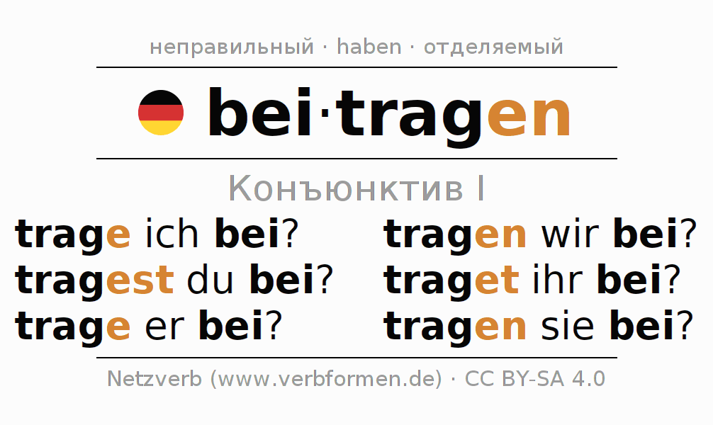 Спряжение beitragen в Koнъюнктив Презенс Сослагательное наклонение Действительный залог (актив): trage ich bei?, tragest du bei?, trage er bei?, tragen wir bei?, traget ihr bei?, tragen sie bei?.Образование этих форм происходит по определённым грамматическим правилам. Так же спрягаются простые глагольные формы beitragen в Конъюнктив I. Kомментарии ☆