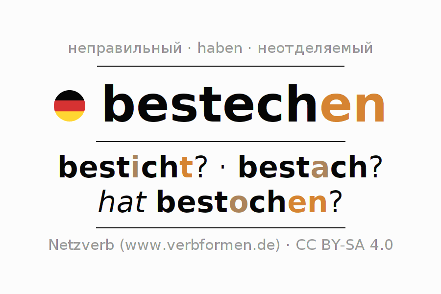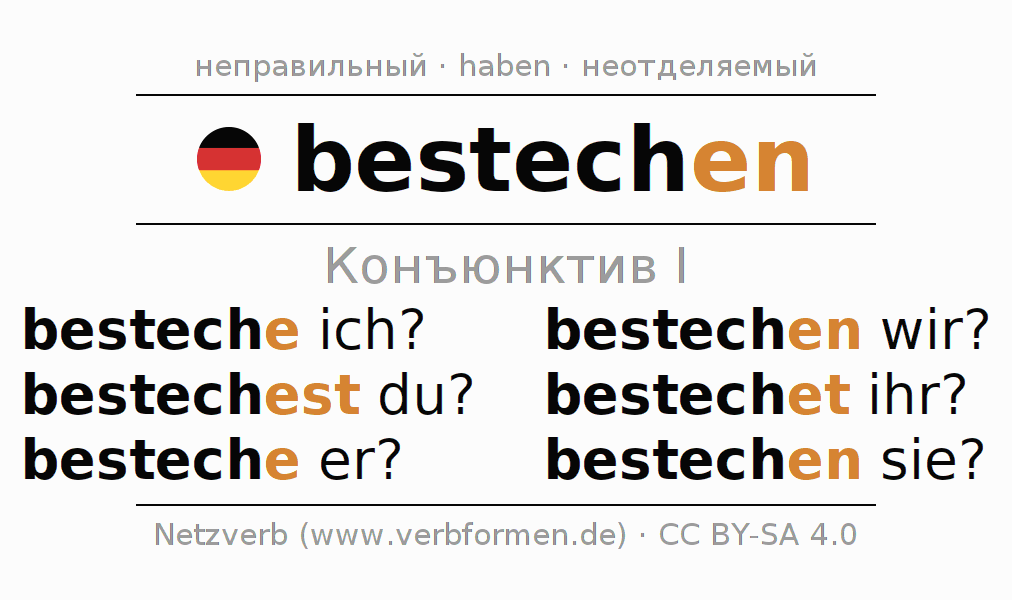 Спряжение bestechen в Koнъюнктив Презенс Сослагательное наклонение Действительный залог (актив): besteche ich?, bestechest du?, besteche er?, bestechen wir?, bestechet ihr?, bestechen sie?.Образование этих форм происходит по определённым грамматическим правилам. Так же спрягаются простые глагольные формы bestechen в Конъюнктив I. Kомментарии ☆